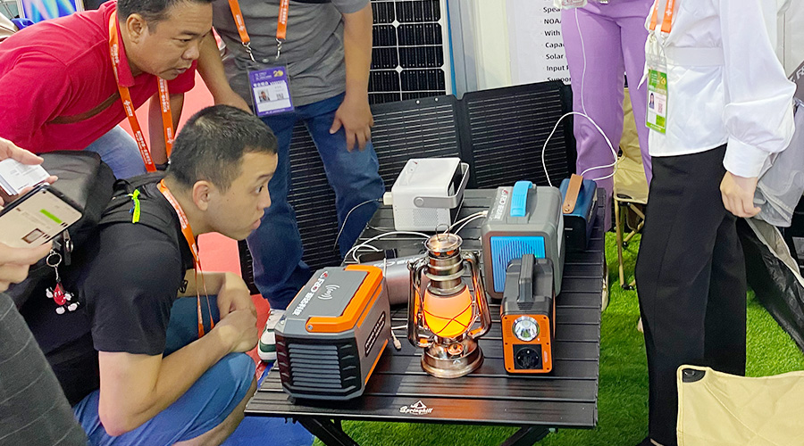 露营的时候想看电影?投影功能安排!想听音乐?AI智能音箱安排!担心电量不够?便携式光伏太阳能板安排!你和你的小伙伴们想同时充电?10台设备同时支持用电安排!这就是本届东博会上华体会科技推出的重磅新品——AI便携式储能电源PH2380。