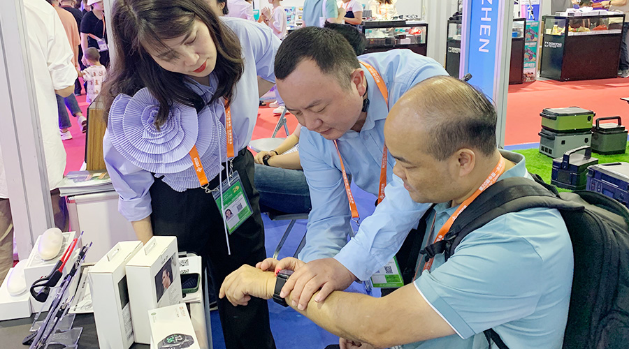 华体会科技全自研算法检测血压的智能手表Gamma Watch 在展会期间也大放异彩,不少东南亚国家商会的代表都对Gamma Watch内置的气泵血压检测技术表示出相当大的兴趣,现场体验后对于其测量的准确度、佩戴的舒适度表示认可。